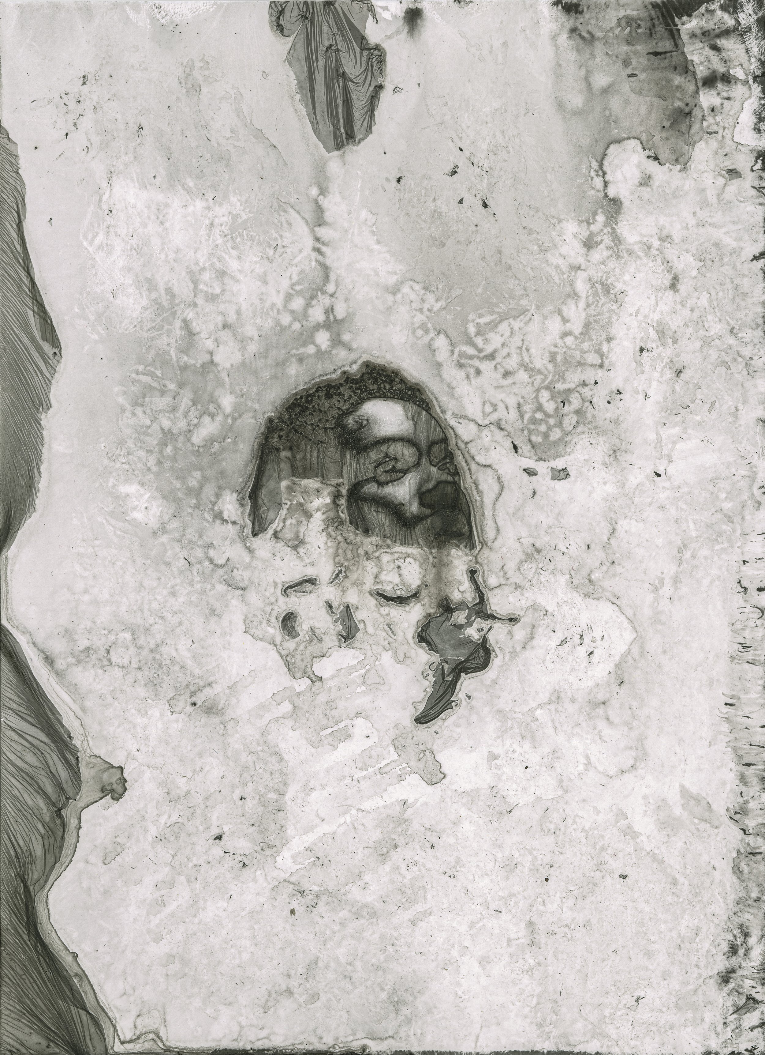 The process is simple yet very particular. I begin by creating a silver gelatin print from a black-and-white 35mm negative. The print is then immersed in a Mordançage bleach solution for several minutes, until the image appears to vanish and a faint yellow ghost of the print emerges. After bleaching, the print is thoroughly washed and redeveloped, allowing the image to resurface. If the gelatin has not lifted sufficiently, the process is repeated. Because the gelatin behaves unpredictably as it cracks, lifts, and separates from the deepest blacks of the image, this cycle is repeated multiple times, forming a continuous loop until the work begins to take on a form that feels meaningful to the artist. The final image is never predetermined; instead, it gradually reveals itself through repeated trials, experimentation, and chance.