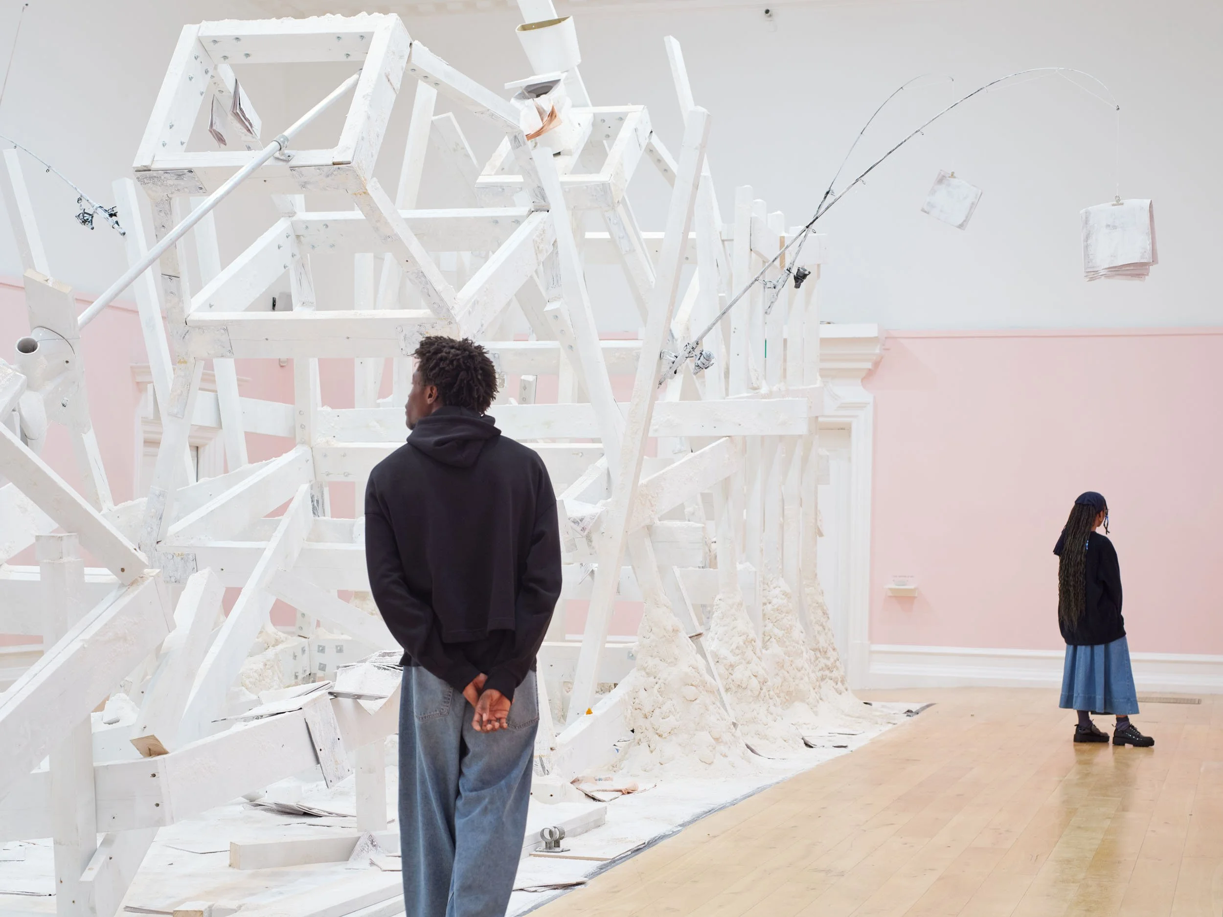 Continuing his cultural critique in this current exhibition, Pope.L reworked another of his most acclaimed pieces, Eating the Wall Street Journal, in which the artist sat on a toilet covered in flour, reading and then eating bits of the Wall Street Journal lubricated with ketchup and milk. The piece was in response to an advert that claimed that just buying a copy of the magazine alone would increase your wealth. Entering the main gallery space through a red butcher’s curtain, you meet face to face with the pandemonium of his new adaptation of the work. Seeing the performance element removed, large scale wooden towers, tilted and paused in a state of collapse, jut out from the centre of the room, angular and enormous, with unusable toilets haphazardly falling and out of reach, copies of the magazine torn and dirtied with flour, placed at the sides of the gallery for viewers to sprinkle on the work at their own leisure. Chaotic and decaying, the structure feels like a bomb site, a ghost town, a decrepit memorial to the original piece, that captures the absurdity of the capitalist hell we currently exist in: an image that we can hold up and examine like a reflection in a mirror. The chaos I see before me is almost calming in this way, in fact I am grateful to see the discomfort and dysregulation of the city outside reflected within this otherwise peaceful haven - it feels right that we shouldn’t be able to shy away from the reality of such serious issues, and they should be highlighted in creative spaces, especially when those spaces are frequented by those who may have enough privilege to be personally affected by them.